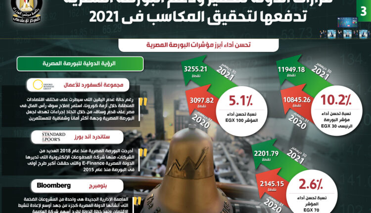 تلعب البورصة المصرية دوراً محورياً في دعم خطط التنمية الاقتصادية والاجتماعية، باعتبار أسواق المال أحد الأعمدة الرئيسية لمساعدة الكيانات الاقتصادية المختلفة في الوصول إلى التمويل اللازم للتوسع والنمو، وهو ما دفع الدولة لتدعيم البنية التشريعية والتنظيمية والتكنولوجية لسوق المال المصري حتى يكون قادراً على المنافسة إقليمياً ودولياً، ودعم قطاع المشروعات المتوسطة والصغيرة من خلال سوق الشركات الصغيرة والمتوسطة، بالإضافة إلى توفير بيئة جاذبة للاستثمار تضمن الحماية الكاملة لحقوق المستثمرين، بجانب تطبيق أفضل الممارسات الدولية المتعلقة بالشفافية والنزاهة، والرقابة على التداول. وفي هذا الصدد نشر المركز الإعلامي لمجلس الوزراء تقريراً تضمن إنفو جرافات تسلط الضوء على المكاسب التي حققتها البورصة المصرية في عام 2021 بفضل القرارات التي اتخذتها الدولة لتحفيزها ودعمها.وكشف التقرير عن تحسن أداء أبرز مؤشرات البورصة المصرية، لافتاً إلى تحسن أداء المؤشر الرئيسي EGX 30 بنسبة 10.2%، حيث سجل 11949.18 نقطة في 30 ديسمبر 2021 مقارنة بـ 10845.26 نقطة في 31 ديسمبر 2020، بينما تحسن أداء المؤشر EGX 70 بنسبة 2.6%، ليسجل 2201.79 نقطة في 30 ديسمبر 2021 مقارنة بـ 2145.15 نقطة في 31 ديسمبر 2020.كما تحسن أداء المؤشر EGX 100 بنسبة 5.1%، حيث سجل 3255.21 نقطة في 30 ديسمبر2021 مقارنة بـ 3097.82 نقطة في 31 ديسمبر 2020.وأضاف التقرير أن رأس المال السوقي ارتفع بنسبة 17.5%، حيث وصل إلى 765 مليار جنيه عام 2021 مقارنة بـ 651 مليار جنيه عام 2020، بينما زادت قيم التداول بالسوق الرئيسي بنسبة 45%، حيث سجلت نحو تريليون جنيه عام 2021 مقارنة بـ 689.6مليار جنيه عام 2020.كما زادت أعداد المكودين الجدد بنسبة 136%، حيث ارتفعت لـ 59 ألف فرد عام 2021 مقارنة بـ 25 ألف فرد عام 2020، وكذلك زادت قيمة تداولات السندات بنسبة 43.9%، حيث وصلت لـ 544 مليار جنيه عام 2021 مقارنة بـ 378 مليار جنيه عام 2020.يأتي هذا فيما زادت قيمة تداولات الأسهم بنسبة 33.3%، حيث سجلت 368 مليار جنيه عام 2021 مقارنة بـ 276 مليار جنيه عام 2020، وأيضاً زادت قيمة تداولات الأسهم غير المقيدة بنسبة 165.7%، حيث سجلت 93 مليار جنيه عام 2021 مقارنة بـ 35 مليار جنيه عام 2020.واستعرض التقرير الإجراءات التي ساهمت في تحسين أداء البورصة المصرية، مشيراً إلى تخفيض مصاريف التداول الخاصة بالبورصة، وهيئة الرقابة المالية، ومصر للمقاصة، وصندوق حماية المستثمر من المخاطر غير التجارية، فضلاً عن احتساب الربح من خلال مقارنة سعر الاقتناء أو سعر إغلاق الأسهم قبل بدء التطبيق أيهما أعلى، مقارنة بسعر البيع لزيادة عوائد المستثمرين.ومن بين الإجراءات أيضاً، تعديل قواعد إصدار الأسهم الممتازة لزيادة المرونة في إصدارها، وإلغاء ضريبة الدمغة على تعاملات سوق الأوراق المالية بالنسبة للمستثمر المقيم لضمان عدالة عدم دفع ضريبة في حالة الخسارة، وخصم جميع المصاريف الخاصة بالتداول وحفظ الأسهم وغيرها من التكاليف التمويلية إن وجدت في الوعاء الضريبي.وكذلك تشمل الإجراءات وفقاً للتقرير، احتساب حافز للأموال المستثمرة في البورصة وخصمها من الوعاء الضريبي في حال تحقيق أرباح، وتخفيض الضريبة على الربح الرأسمالي المحقق في الطروحات الجديدة بنسبة 50%، فضلاً عن تخفيض نسبة الضريبة على المستثمرين الأفراد من خلال صناديق الأسهم إلى 5% على الربح الرأسمالي المحقق.كما تتضمن الإجراءات، إعفاء صناديق الاستثمار في الأسهم من كافة الضرائب على الأسهم وتكليف الصندوق باحتسابها وتوريدها بدون فتح ملفات ضريبية للمستثمرين في الوثائق، فضلاً عن تيسير تنفيذ الخدمات المقدمة للشركات المقيدة في البورصة.وبالإضافة إلى ما سبق، ذكر التقرير أنه تم توجيه مبالغ بنحو 20 مليار جنيه من البنك المركزي لدعم وتحفيز البورصة المصرية والمساهمة في انتعاش السوق.هذا وقد رصد التقرير النظرة الدولية لأداء البورصة المصرية، مشيراً إلى ما ذكرته مجموعة أكسفورد للأعمال، بشأن استمرار إصلاح سوق رأس المال في مصر على قدم وساق، رغم حالة عدم اليقين ال