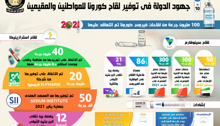 وفي هذا الصدد، نشر المركز الإعلامي لمجلس الوزراء، تقريراً تضمن إنفو جرافات تسلط الضوء على جهود الدولة في توفير لقاح كورونا للمواطنين والمقيمين، وذلك في إطار الخطة الشاملة لمواجهة الفيروس.