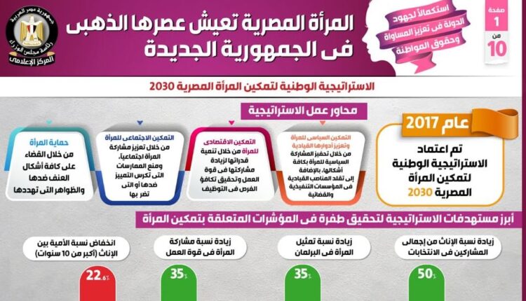 حظيت المرأة المصرية بمكتسبات فريدة وغير مسبوقة في عهد الجمهورية الجديدة، حيث حرصت الدولة المصرية على إطلاق الاستراتيجيات والمبادرات والبرامج المجتمعية الداعمة للمرأة، مما أسهم في بناء قدراتها وتمكينها سياسياً واقتصادياً واجتماعياً، وإدماجها كعنصر فاعل ورائد في خطط التنمية المستدامة، فضلاً عن الحفاظ على تلك المكتسبات من خلال وضع إطار تشريعي ومؤسسي داعم لحقوقها، مع الحرص على الارتقاء بدورها في شتى المجالات، وتعزيز قدرة المرأة على مواجهة التحديات من خلال تحفيز المساواة في المجتمع وتكافؤ الفرص، لتعكس تلك الجهود حجم رهان الدولة على المرأة المصرية وقدرتها على الاضطلاع بجدارة بالعديد من الإنجازات، إلى جانب دورها في الحفاظ على نسيج المجتمع وروابطه. وفي هذا الصدد نشر المركز الإعلامي لمجلس الوزراء تقريراً تضمن إنفوجرافات تحت عنوان ” المرأة المصرية تعيش عصرها الذهبي في الجمهورية الجديدة ” وذلك في ضوء استكمال الدولة لجهودها في تعزيز المساواة وحقوق المواطنة.واستعرض التقرير محاور الاستراتيجية الوطنية لتمكين المرأة المصرية 2030، والتي تم اعتمادها في عام 2017، حيث شملت التمكين السياسي للمرأة وتعزيز أدوارها القيادية من خلال تحفيز المشاركة السياسية لها بكافة أشكالها، بالإضافة إلى تقلد المناصب القيادية في المؤسسات التنفيذية والقضائية.كما تشمل محاور الاستراتيجية أيضاً، التمكين الاقتصادي للمرأة من خلال تنمية قدراتها لزيادة مشاركتها في قوة العمل وتحقيق تكافؤ الفرص في التوظيف، إلى جانب التمكين الاجتماعي للمرأة من خلال تعزيز مشاركتها اجتماعياً، ومنع الممارسات التي تكرس التمييز ضدها أو التي تضر بها، بالإضافة إلى حماية المرأة من خلال القضاء على كافة أشكال العنف ضدها والظواهر التي تهددها. وتناول التقرير أبرز مستهدفات الاستراتيجية لتحقيق طفرة في المؤشرات المتعلقة بتمكين المرأة، وتتضمن زيادة نسبة الإناث من إجمالي المشاركين في الانتخابات لتبلغ 50% عام 2030، مقارنة بـ 44% عام 2014، فضلاً عن زيادة نسبة تمثيل المرأة في البرلمان لتصل إلى 35% عام 2030، مقابل 27.8% عام 2022.وتشمل مستهدفات الاستراتيجية أيضاً وفقاً للتقرير، ارتفاع نسبة مشاركة المرأة في قوة العمل بنسبة 35% عام 2030، مقارنة بـ 15.2 % عام 2021 كبيان أولي، علاوة على انخفاض نسبة الأمية بين الإناث (أكبر من 10 سنوات) لتسجل 12% عام 2030، مقابل 22.6% عام 2020. وتطرق التقرير إلى الحقوق السياسية للمرأة، حيث زادت نسبة تمثيل المرأة في مجلس النواب، لتصل إلى 27.8% عام 2022بعدد 165 مقعداً، مقارنة بـ 14.9% عام 2016 بعدد 89 مقعداً، و1.8% عام 2012 بعدد 9 مقاعد.
